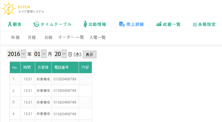 2.「時間」「お客様」「電話番号」「内容」の順で日毎に表示されます。