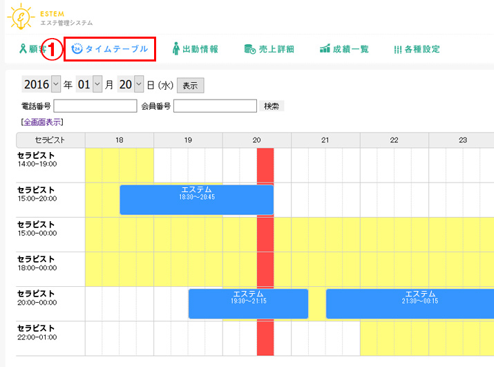 1.ESTEMにログインした後、上部のメニューの①[タイムテーブル]を選択して下さい。